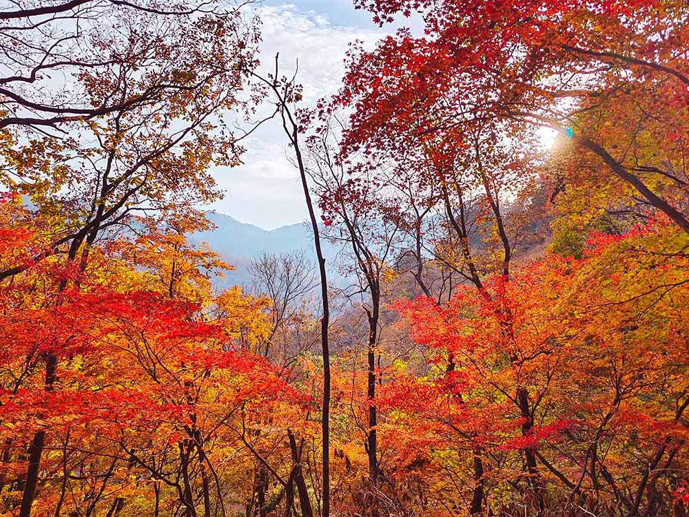 丹东天桥沟作为国家4A级旅游景区,被誉为“中国枫叶最红最艳的地方”,更是“关外小庐山”般的天然秘境,每到深秋,漫山遍野的枫叶次第绽放,烈焰红、蜜糖色与苍翠绿交织共生,将山谷渲染成一幅壮阔绚丽的天然油画,恰逢10月中旬赏枫黄金时段,层林尽染的美景为本次活动增添了别样韵味。听风吹枫叶沙沙作响,看阳光透过枝叶洒下斑驳光影,近距离感受天桥沟枫叶的绚烂与灵动,沉浸式体验自然之美。